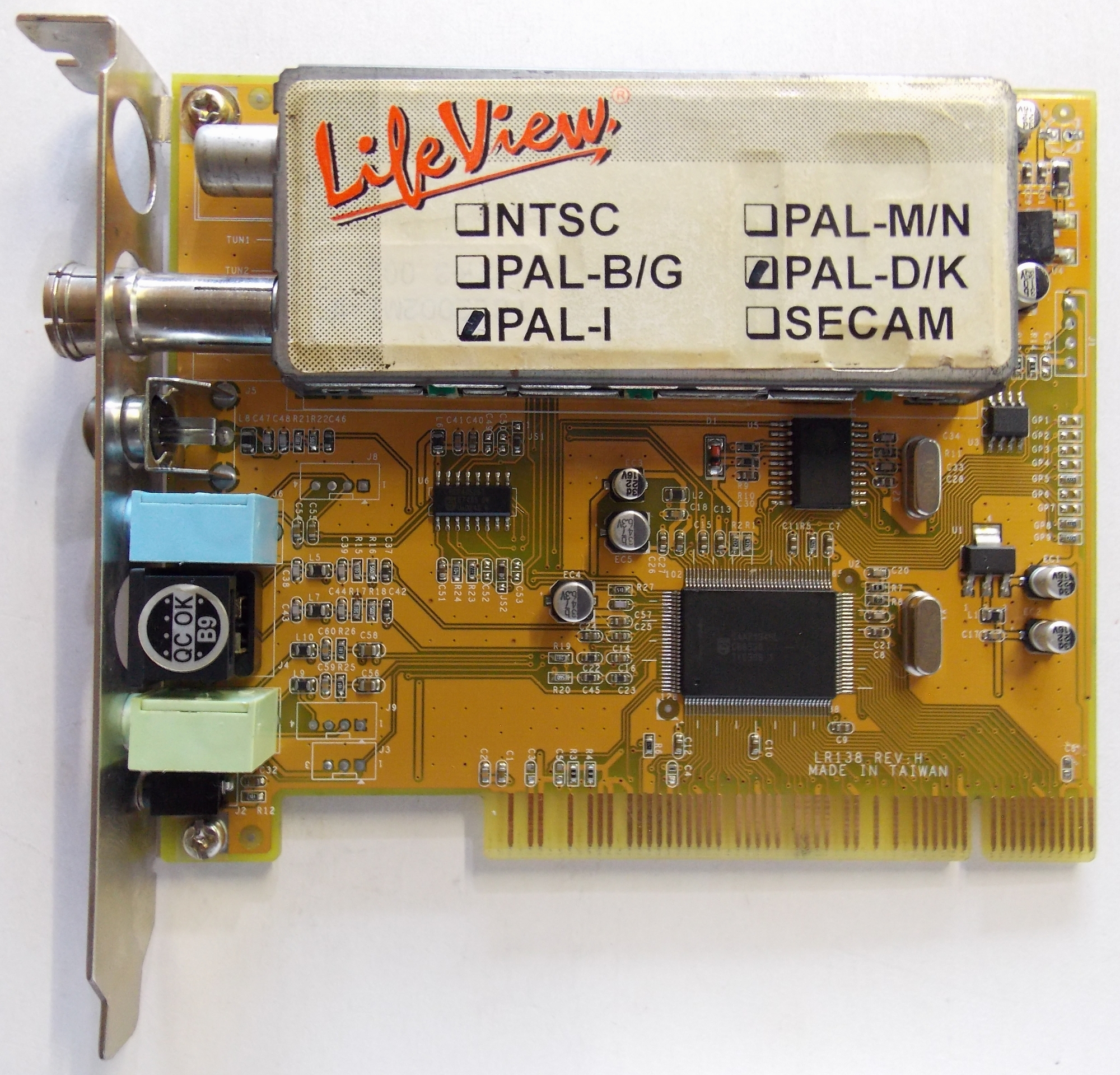 | Model | LR138 Rev H | | Bus | PCI | | Chipset | Philips SAA7134HL | | Connectors | 3.5mm audio in 3.5mm audio out Composite video (RCA) Radio RF input (Belling-Lee) Remote IR receiver (2.5mm TRS) S-video TV RF input (Belling-Lee) |